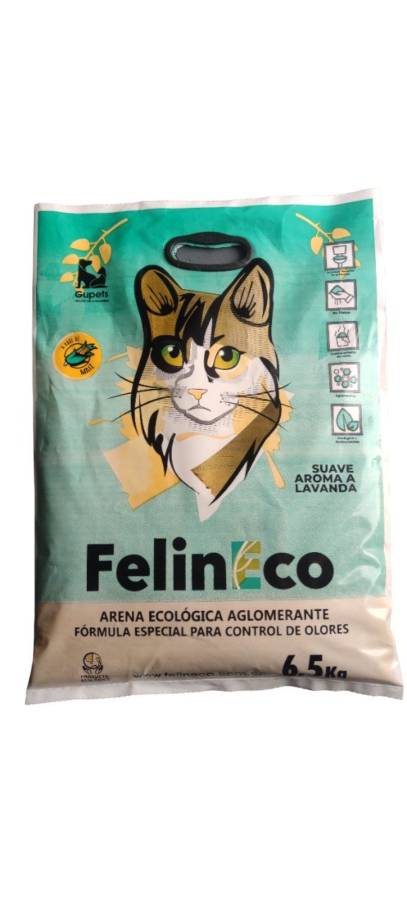 Arena Felineco Lavanda: ecológica, biodegradable, aglomerante y libre de polvo. Con aroma a lavanda, ideal para el bienestar de tu gato y el medio ambiente.