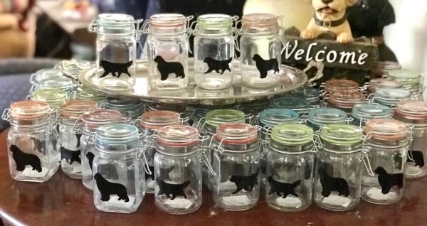 Frasco de vidrio redondo, hexagonal o cuadrado con tapa hermética y silicona en varios colores (rojo, azul, verde o anaranjado) pintado a mano. 6 cms diametro por 11 cms alto. Con o sin galletas para perro.