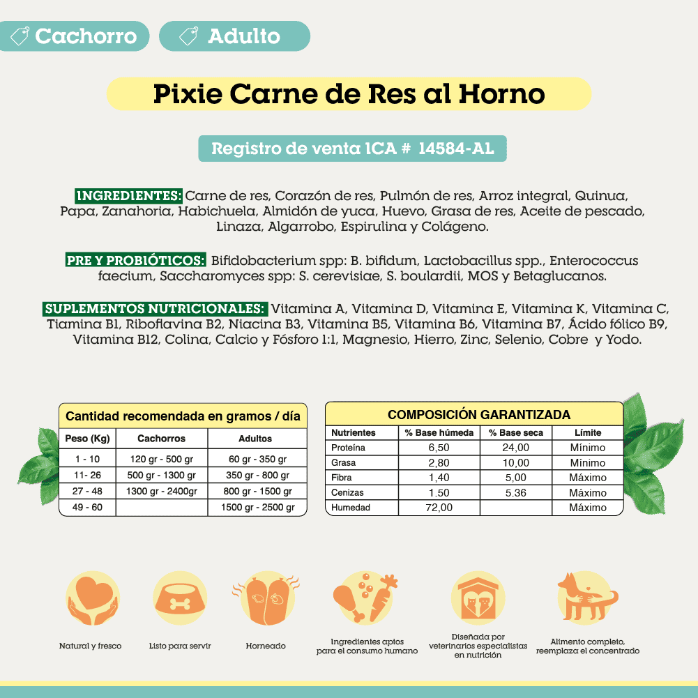 INGREDIENTES Y NUTRICIÓN PIXIE DE CARNE DE RES AL HORNO PARA PERROS CACHORROS Y ADULTOS