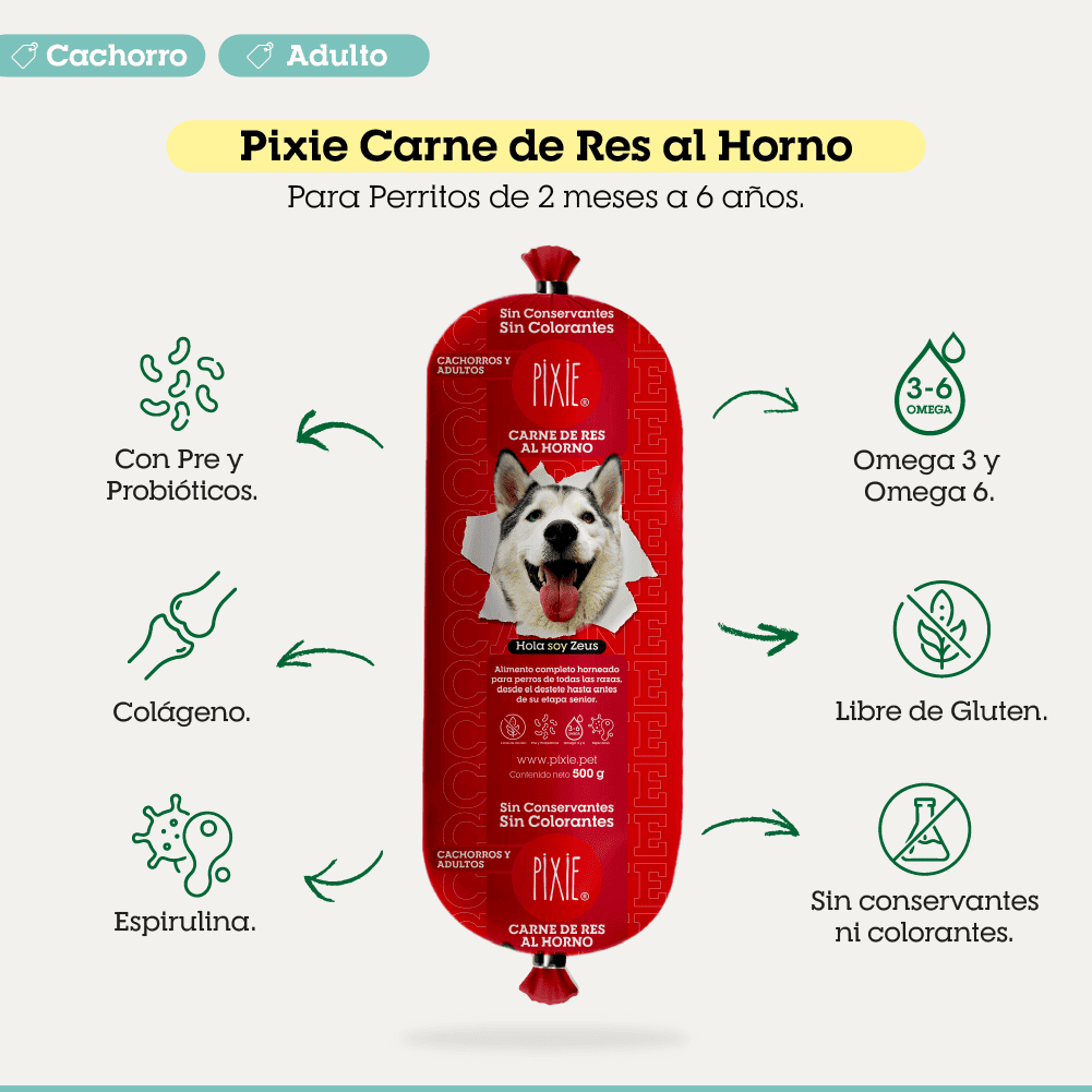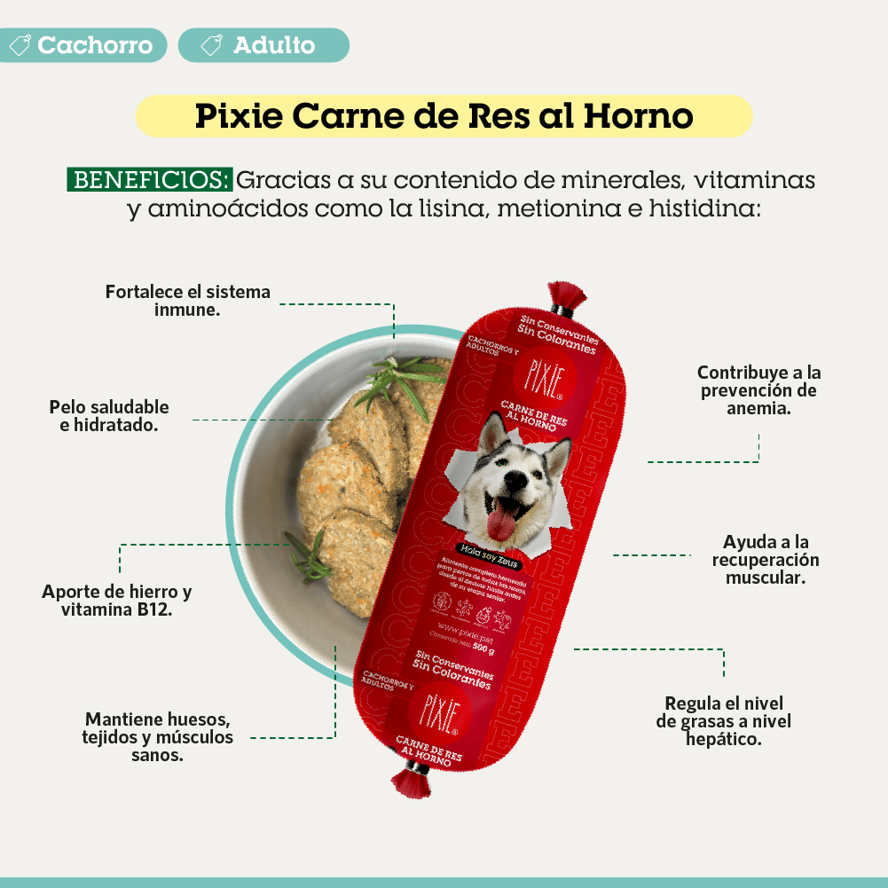 BENEFICIOS Y CARACTERÍSTICAS PIXIE DE CARNE DE RES AL HORNO PARA PERROS CACHORROS Y ADULTOS