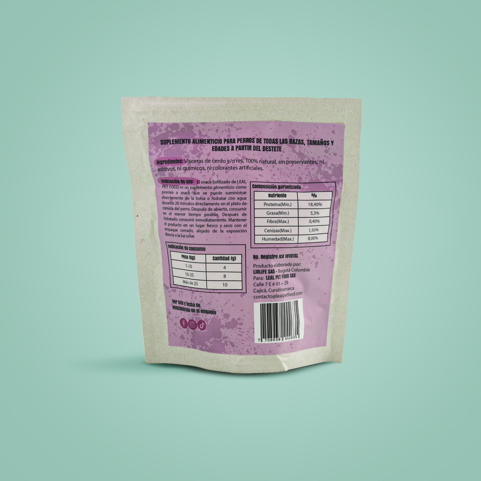 Este 100% natural, es el complemento perfecto para consentir a tu perrito. Elaborado únicamente con visceras de cerdo y/o res, ofrece un sabor irresistible y un aporte nutricional inigualable. Puedes suministrarlo directamente desde la bolsa para un snack rápido y saludable, o hidratarlo en agua durante 20 minutos para agregarlo a su plato de comida. Mantén el producto en un lugar fresco y seco, alejado de la exposición directa a la luz solar, para preservar su frescura y calidad.